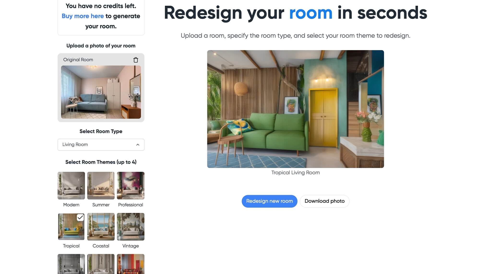 After that, we clicked the “Render designs” button, and just in a couple of seconds, the tropical redesign picture of the room was ready. Yeah, AI transformed a closet into a door, but the redesign still looks good. As a final step, we clicked “Download photo” to export the result.