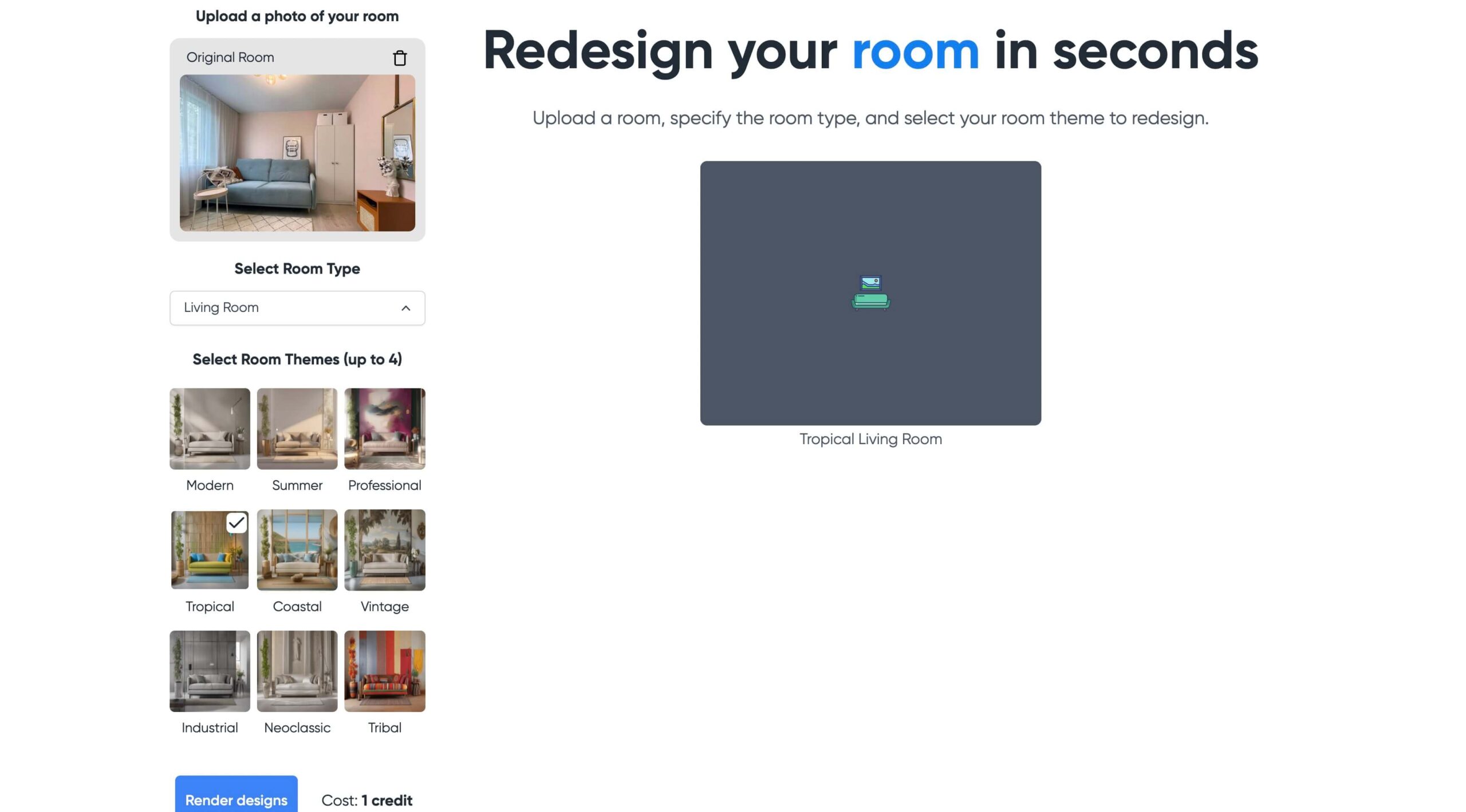 Then on the main dashboard page, we uploaded a casual living room image from the open source. The website provided us with one free credit to redesign the room, and we selected one of the available redesign styles. You can select up to 4 designs at the same time, and each one will cost you one credit.