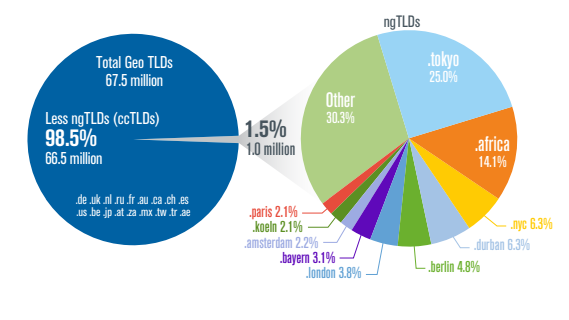 Finally, some new domain roots are related to geographic location. These geo ngTLDs often correspond to cities or regions. There are 67.5 million geo ngTLDs today.