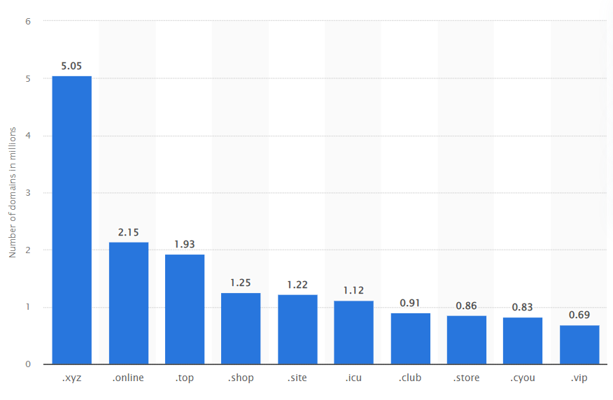 In one 2022 study of ngTLDs, the #1 was .xyz with 5.05 million domain name registrations. Other popular ngTLDs include .online, .top, .shop, .site, .icu, .club, .store, .cyou and .vip