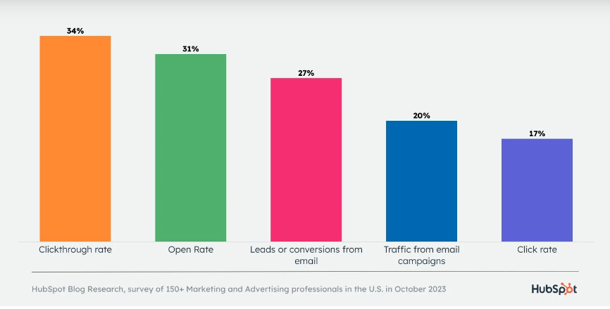 For instance, the top two metrics commonly tracked are the clickthrough rate, with 34% of marketers considering it crucial, and the open rate, valued by 31%.