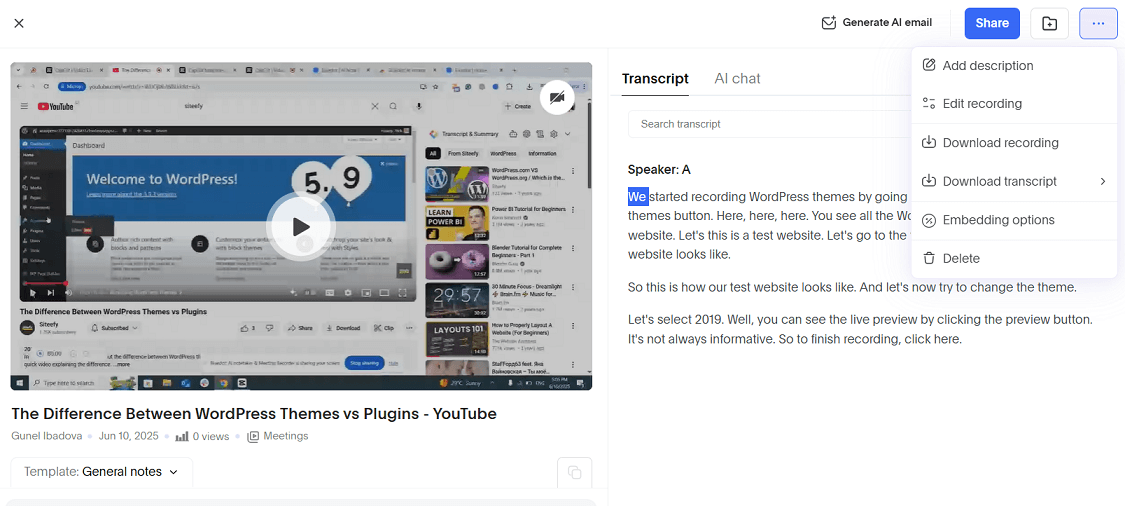 To test the tool, we recorded our screen while playing a video from Siteefy titled_“Difference Between WordPress Themes and Plugins.”_We simply clicked the “Start Recording” button, and once finished, we clicked “Stop Recording.”. The tool provided an accurate transcript of the screen recording. You can even interact with the built-in AI chat to ask questions, and it will respond based on the content of the video.