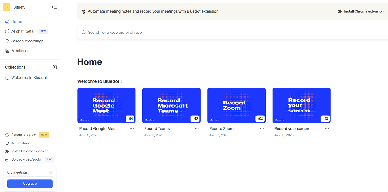 Add the Bluedot Chrome extension or install the app for your platform (iOS, Mac) to enable meeting recording and transcription.