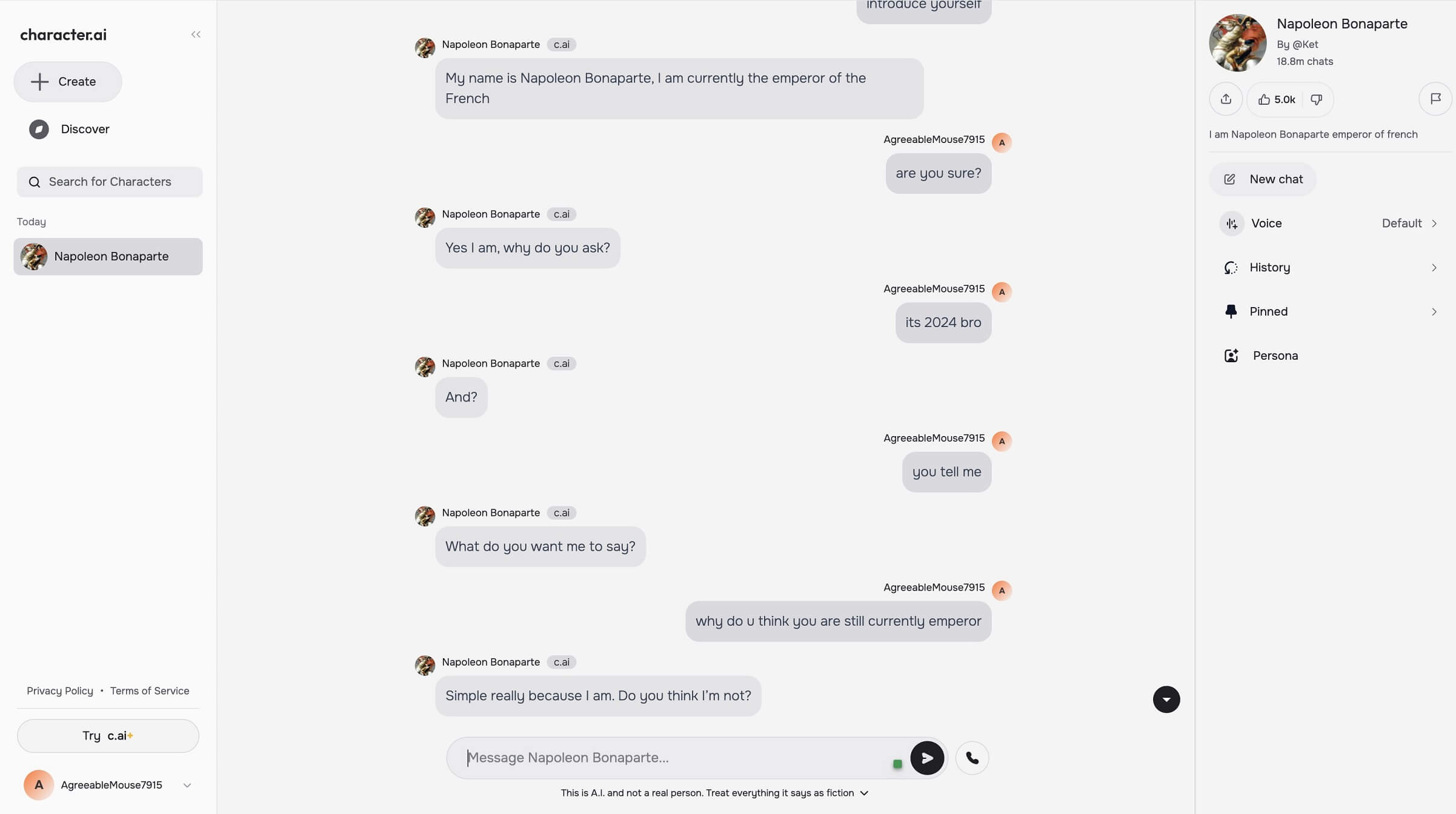 For the test, we selected a historical character with a huge amount of public chats: Napoleon Bonaparte, the emperor of France.Since we started chatting with him, we faced the strong character of the bot, like emperors had to be.