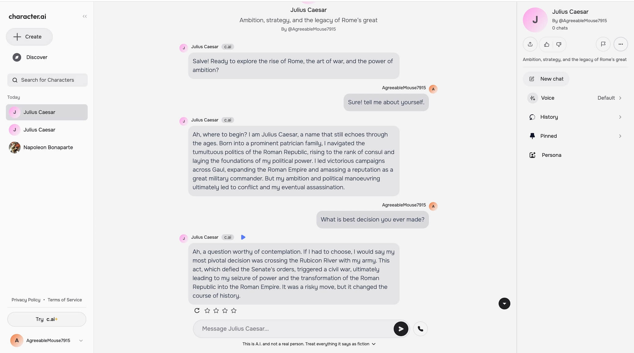 An intuitive chat interface that makes it easy to start conversations and explore character capabilities.