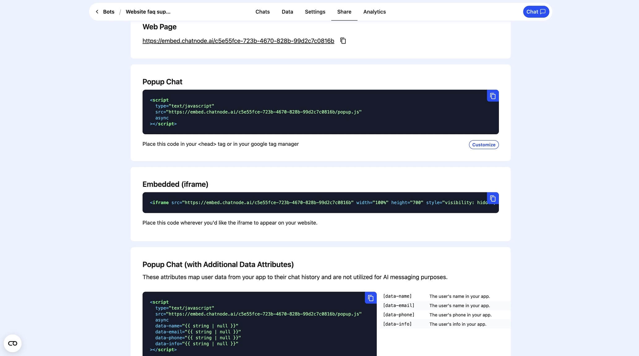 To share the chatbot, we went to the “Share” page, and there were links to the chatbot page and all the codes required to implement it on the website. We highly recommend checking out the website guides for better interaction. Even more, you can switch the AI model for your chatbot right on the main menu page by clicking on the current one's name.