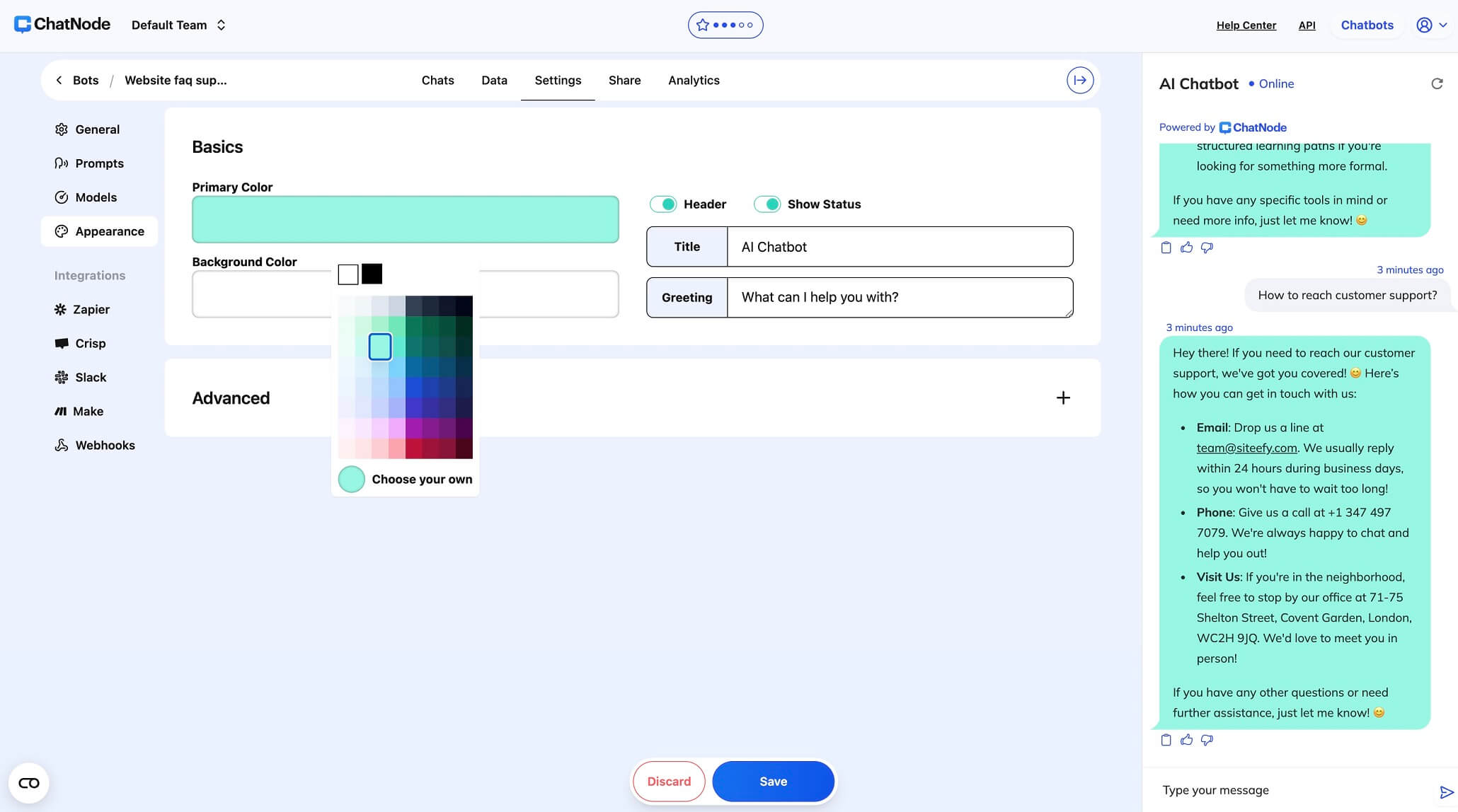 On the “Settings” page, we customized the main design of our future chatbot (primary and background colors, title, and greeting). There were also more advanced customization settings that we left default for testing.