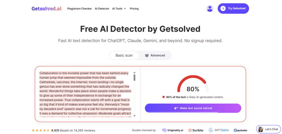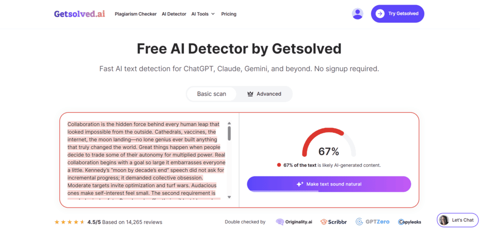 For our test, we used a short AI-generated paragraph about the power of human collaboration and created two versions of it: the original text and a "humanized" version rewritten to sound more natural. We entered both versions into the detector separately. The results were immediate. Interestingly, the edited version—despite sounding more human—was flagged as even more AI-generated than the raw text. This shows that Getsolved.ai’s detector is highly sensitive to AI-style patterns and not easily bypassed through simple rewrites. Screenshots of both results are displayed below.