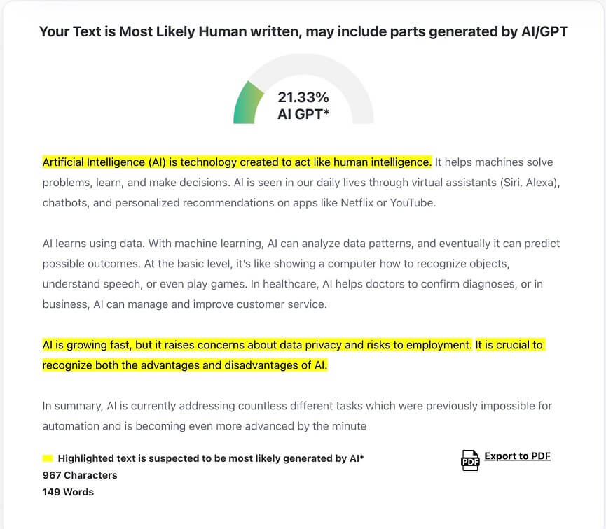 We asked ChatGPT to generate us a quick article with about 150 words about AI.After AI submitted a text we passed it directly to theYour Contentfield and setModetoBasic.