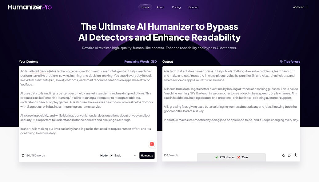 AI Humanizer PRO is a sophisticated AI-powered platform designed to transform AI-generated text into natural, original, and human-like content. It preserves the original meaning while improving tone and flow, helping users bypass popular AI detection tools. The tool supports multiple languages and offers various humanizing modes to suit different content needs, making it ideal for writers, marketers, SEO experts, freelancers, and business professionals.