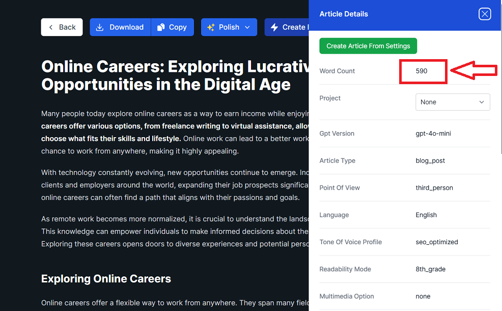 . We thought it might be a technical issue, so we tried generating the article again. Unfortunately, each time, we received the same 590 words.