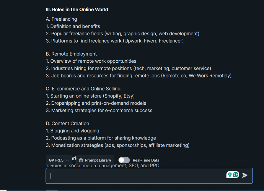 After testing the blog writer, we decided to also test the chat feature. We asked the AI to create an outline for the blog post topic, "How to Succeed in the Online World: Roles You Can Pursue Today." The tool provided a simple, structured outline that was clear.