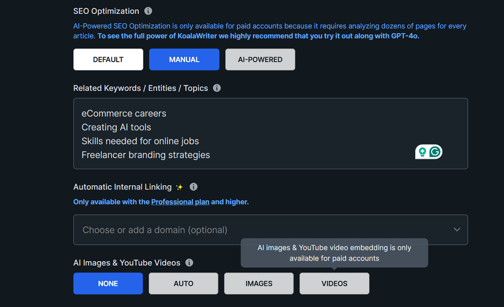 We also manually added keywords that we wanted the AI to include in the article. Unfortunately, features like internal linking, adding videos, or incorporating images are only available for paid plans.