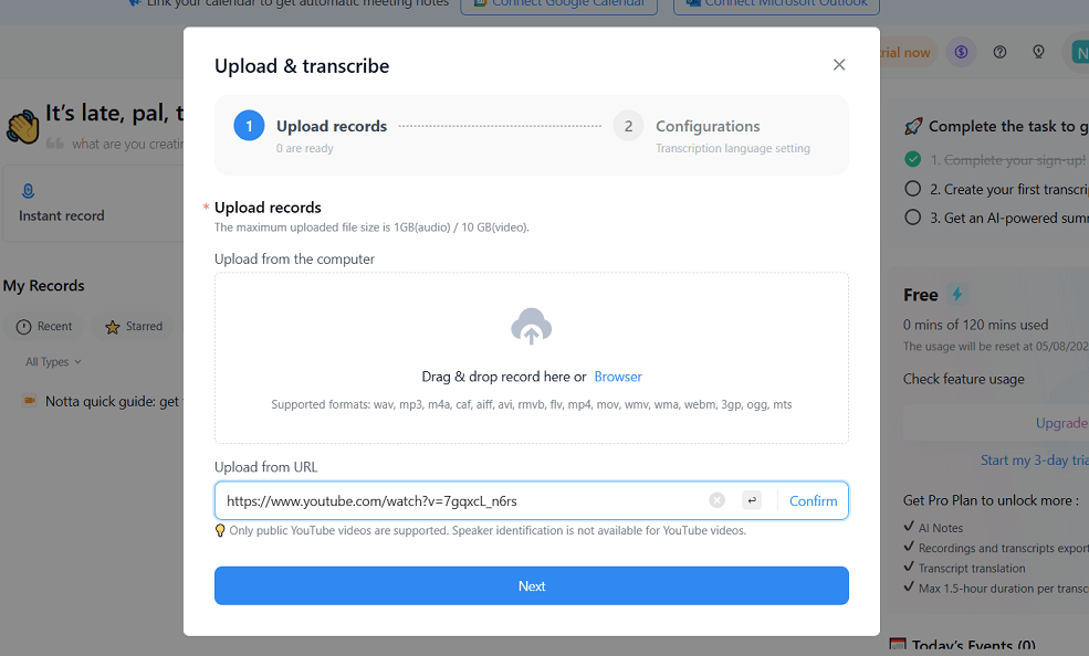 Create a free account on Notta's website and log in to access the dashboard.