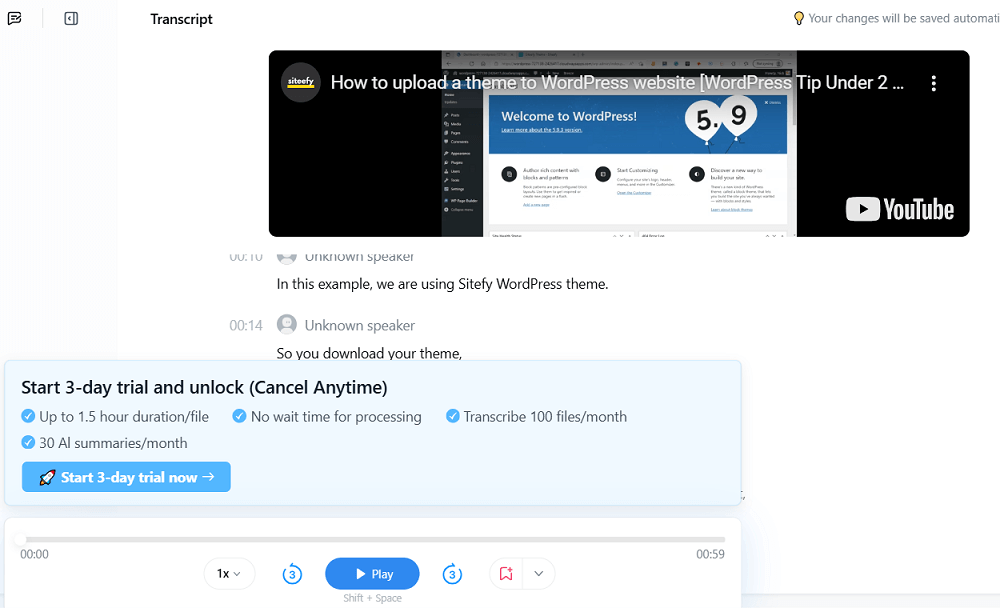 We decided to transcribe a short video from Siteefy's YouTube channel titled_"How to Upload a Theme to a WordPress Website,"_which is under 2 minutes long.We clicked onUpload & Transcribe, where it's possible to drag and drop files, browse from the computer, or paste a URL from YouTube, Dropbox, or Google Drive. We pasted the YouTube URL and clickedNextto begin the transcription process.