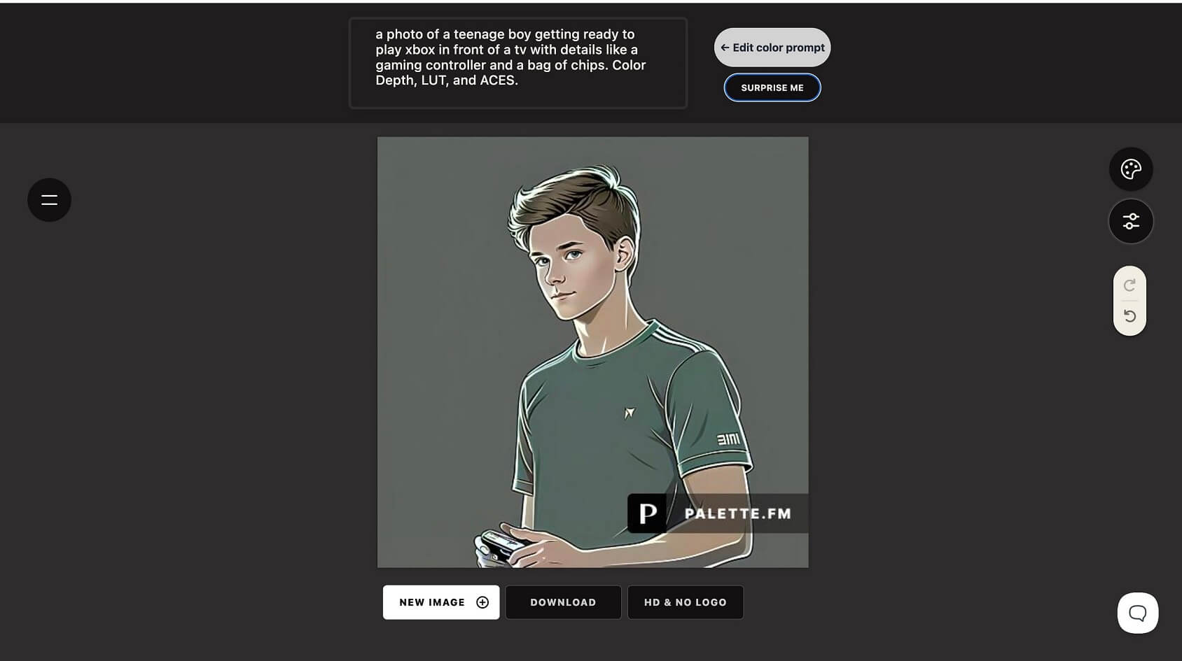During the test, we discovered an interesting button on the right side of the dashboard. Of course, we clicked it, and the text box popped up to insert a palette prompt there. We also used the "Surprise me" button below the text box to have the AI generate a prompt.