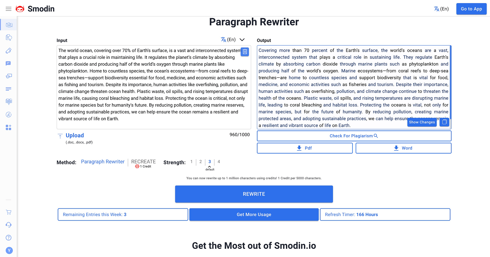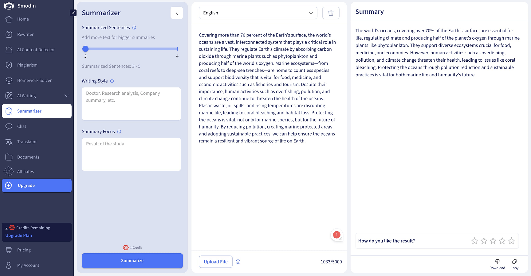 For our test, we signed up using our Google account to get 3 free welcome credits.Some features are also available without signing up.We were looking to rewrite and summarize a small AI-generated essay about the world ocean.