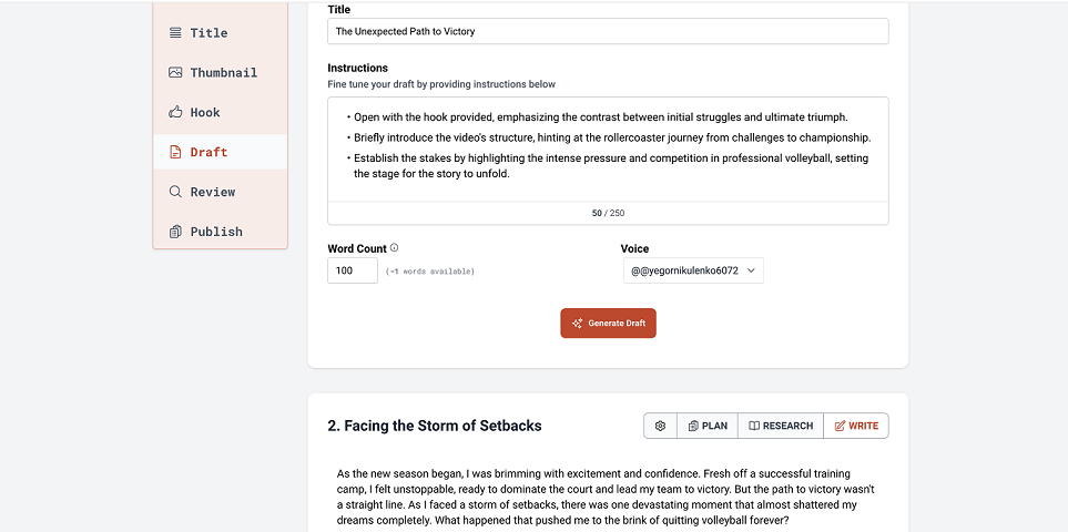 In theDraftsection, AI generated an accurate script for each act of our scenario separately. Here we could choose the amount of words each act will contain.