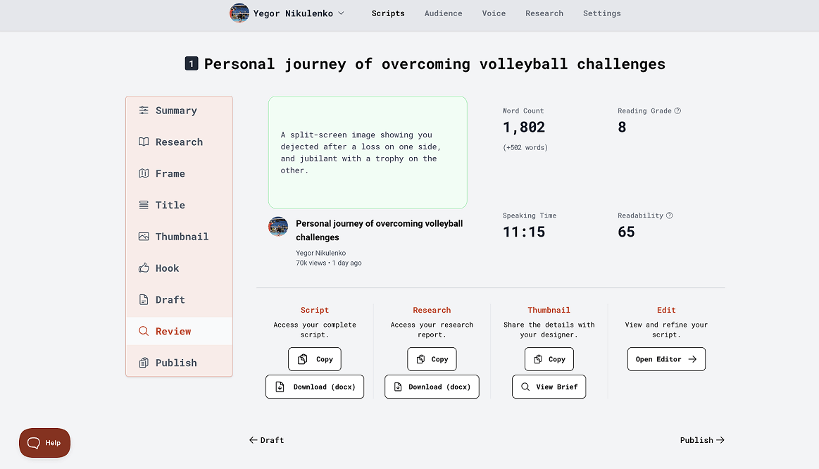 Then we got a quick review of all the jobs we did with AI in the “Review” section. We also were able to copy and download our complete scripts, research reports, and thumbnail ideas to share with our assistant’s channel team.