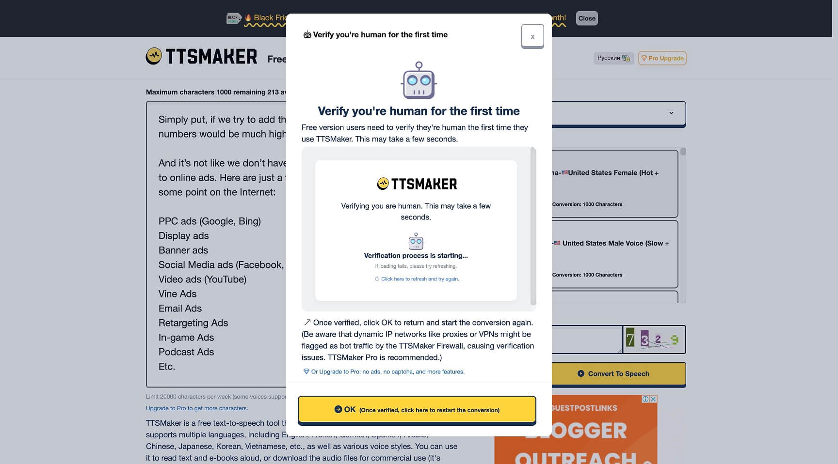 After copypasting our text to the box, we selected one of the available voices in the menu on the right side. Then we clicked the “Convert to Speech” button, and AI generated audio, which we could download right from there. Remember, if you are generating for the first time, there will be a captcha pass required.