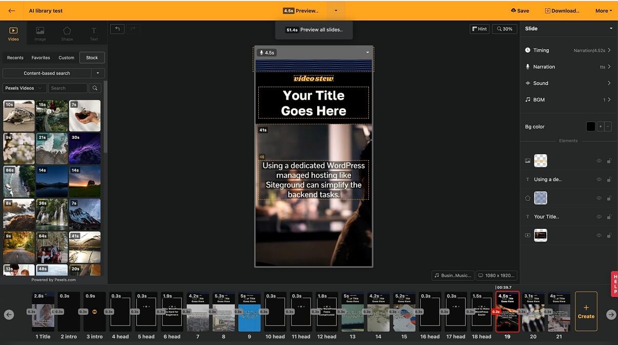 After completing manual customization, we clicked on the Save button on the upper right corner of the project lab page. The tool rendered our video for about a minute, and then we just downloaded it in the resolution we chose.